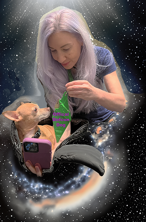 DefCon is the world’s largest tech hacker “conference” – more like a inter-dimensional portal at the Caesars Forum. When we first checked in, we happened to meet the leader of DefCon Press and P.R. She fell for little Boris in a handbag, and declared him the official DefCon 31 dog! What an honor. Way to go Boris, who everyone thinks is a Chihuahua, but is really a Russian Terrier. Nothing is as it seems at DefCon. The guy you see walking around in shorts, who looks like a bearded punk rocker, may actually be a senior NSA fed. We will tell you why the NSA was there later in this series.