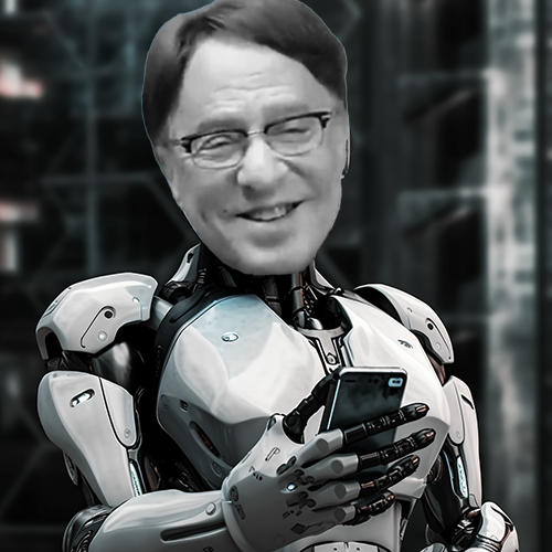 Ray Kurzweil depicted as a future robot using an old smart phone, in photorealistic style using Visual Muse and Photoshop.
