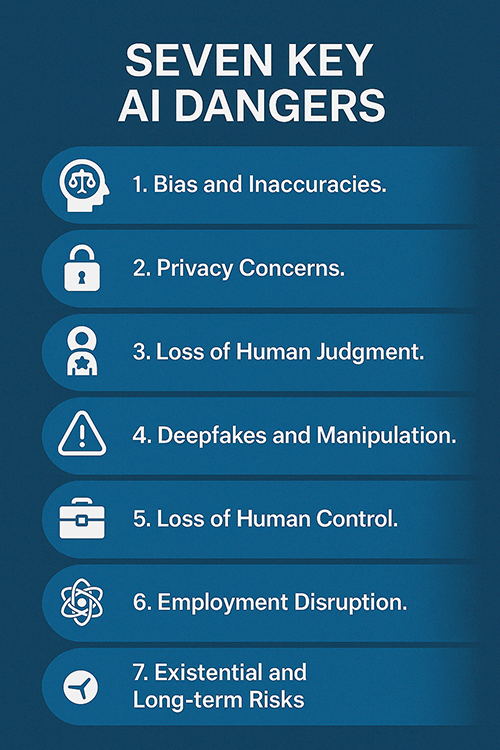 In this article, we break down the seven key dangers AI presents, and more importantly, what you can do to avoid them. Whether you’re a beginner or a seasoned pro, understanding these risks is the first step toward using AI safely, confidently, and effectively.