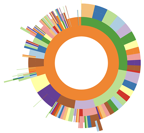 This “Site Map” feature groups all the archives we have for websites by year, then builds a visual site map, in the form of a radial-tree graph, for each year. The center circle is the “root” of the website and successive rings moving out from the center present pages from the site. As you roll-over the rings and cells note the corresponding URLs change at the top, and that you can click on any of the individual pages to go directly to an archive of that URL.